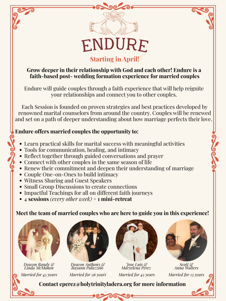 Date Nights: April 10th & 24th, May 1st & 15th from 6:30-8:00pm Retreat on Saturday, May 30th from 10am – 5pm