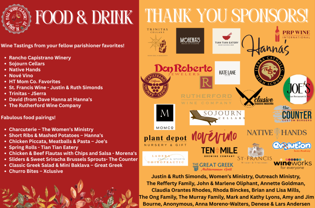 Sponsorship includes special perks such as event tickets, additional commemorative wine glasses, and advertising opportunities. It’s also a meaningful way for local businesses, Holy Trinity ministries, and families to double their impact by making fellowship and fundraising go even further.