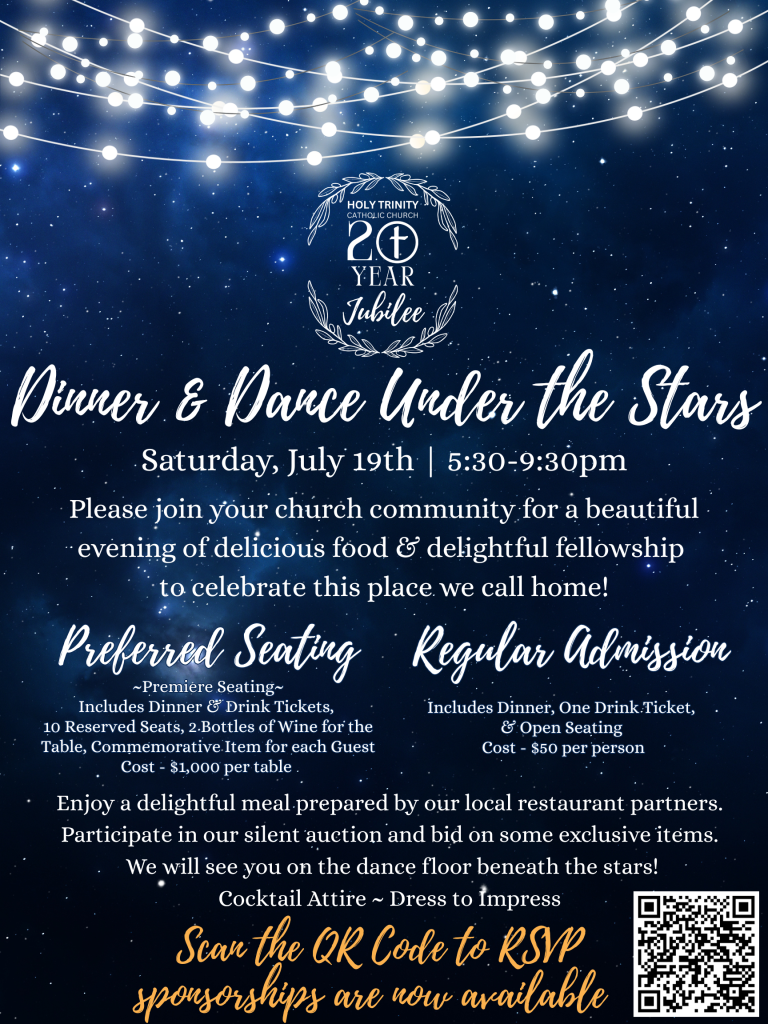 In this Jubilee Year and the 20th anniversary of our founding as Holy Trinity Catholic Church, we praise and thank You for all the blessings we have received. Under your watchful and loving eye, we have grown from a small seed to a thriving and welcoming parish family. We are thankful for the lives of those You have called home to Yourself, those who helped build this vibrant community of love and service.