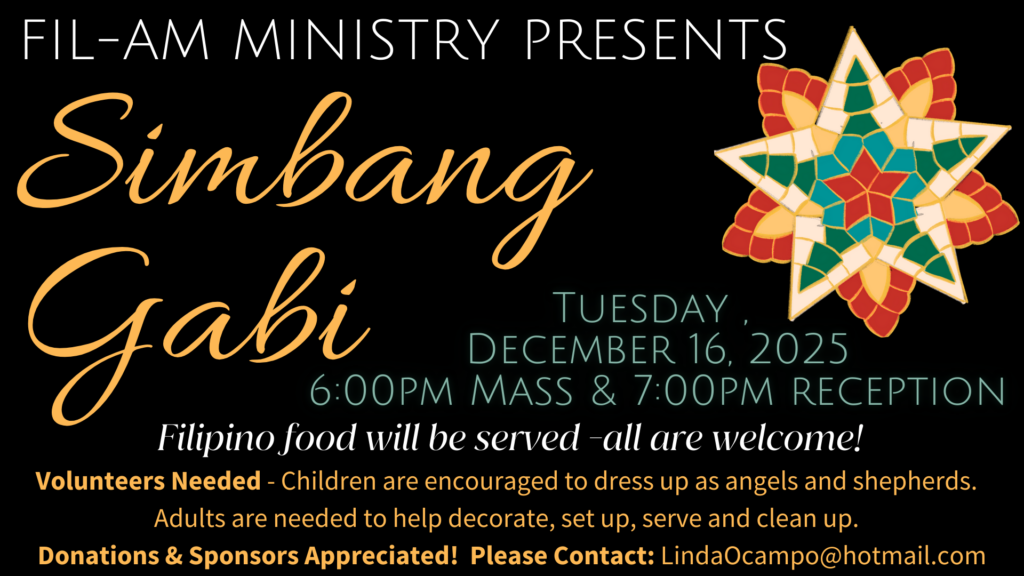 The Filipino-American Ministry (Fil-Am) welcomes not only our Filipino friends but all who are interested in joining our activities. We hope you discover the joy we share when we come together to worship God in spirit and in truth. Our mission is to unite in faith, community and prayer by developing and promoting a faith-based community among Filipino-Americans, their families, extended families, friends and those who have affinity to Filipino culture, values and traditions enriched with American ideals. Our members are involved with social as well as religious and spiritual activities to meet the needs of our parish. Please join us with your talents and ideas!