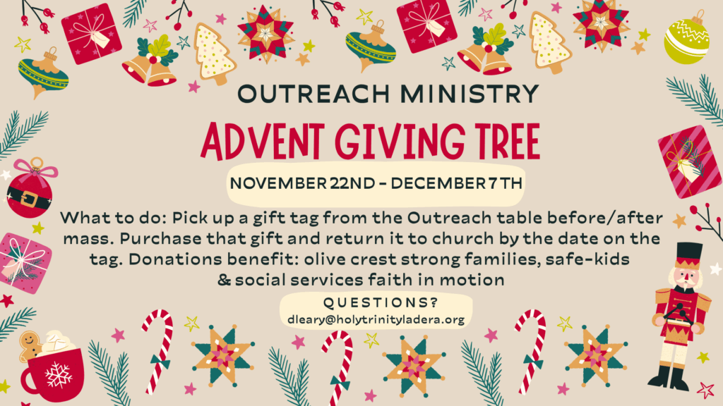 Meeting Parishioner Needs: If you feel called to be on a list with fellow parishioners who could collaboratively meet the needs of a Holy Trinity family, please send an email to the Outreach Ministry to sign up. Potential needs include financial help to get caught up with utility bills, providing school supplies, diapers, formula, or additional gift cards beyond grocery and gas. As these kinds of needs arise, we will reach out to the entire group. There is no commitment for your support. Simply give when you feel called.