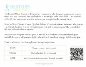 Restore Young Mom’s Retreat from February 27th – March 1st 2026 at Mission San Luis Rey, Oceanside